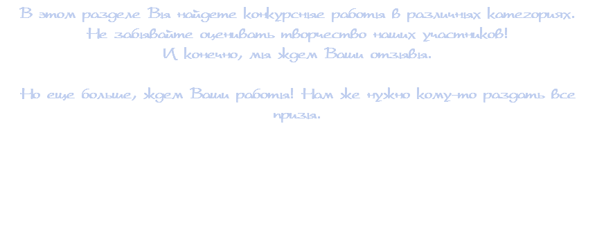 В этом разделе Вы найдете конкурсные работы в различных категориях. Не забывайте оценивать творчество наших участников! И конечно, мы ждем Ваши отзывы. Но еще больше, ждем Ваши работы! Нам же нужно кому-то раздать все призы.